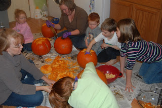 This year we carved pumpkins in the house because it was so chilly outside. The weather has been so rainy and awful this autumn! While carving the pumpkins, Kelli & Company stopped by Carol's house and we promptly invited them over to carve away with us. Yahoo! We made a glorious mess and great fun was had by all.